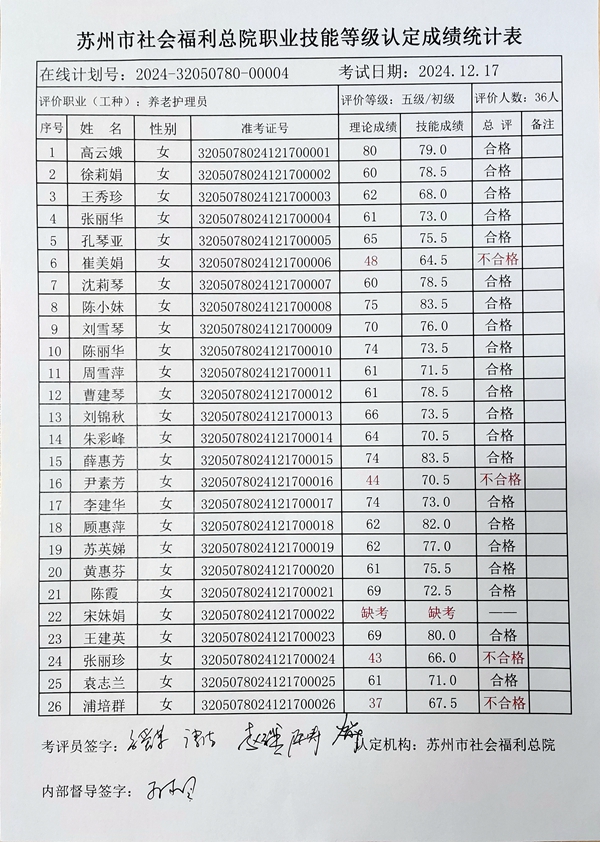 苏州市社会福利总院职业技能等级认定成绩公示