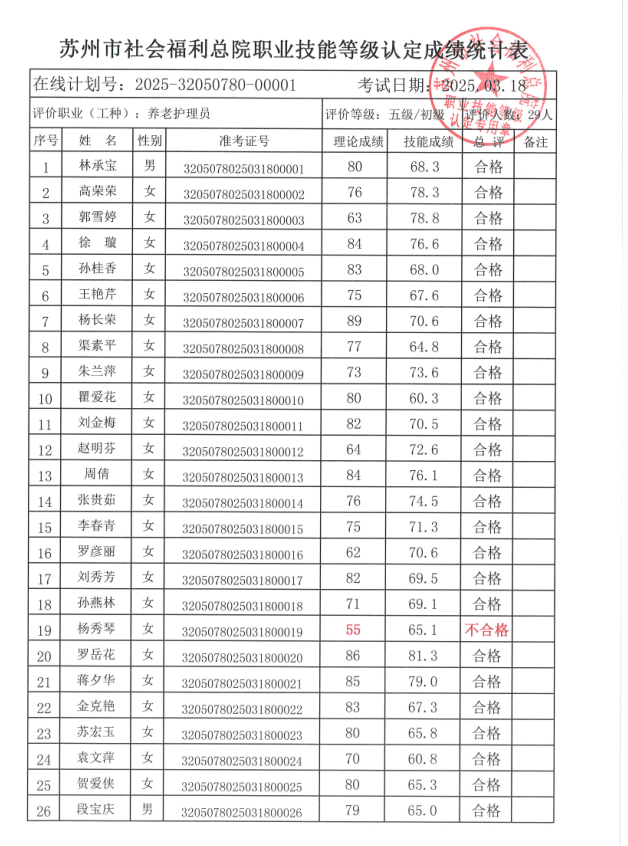 苏州市社会福利总院职业技能等级认定成绩公示(3.18)