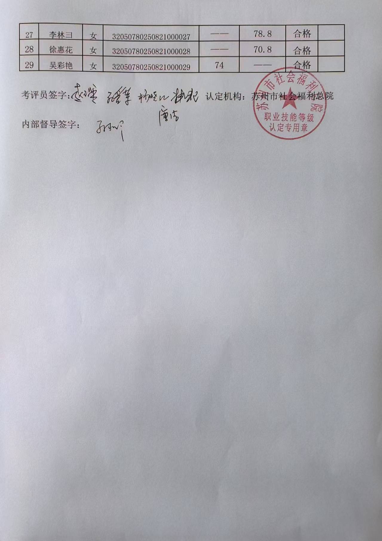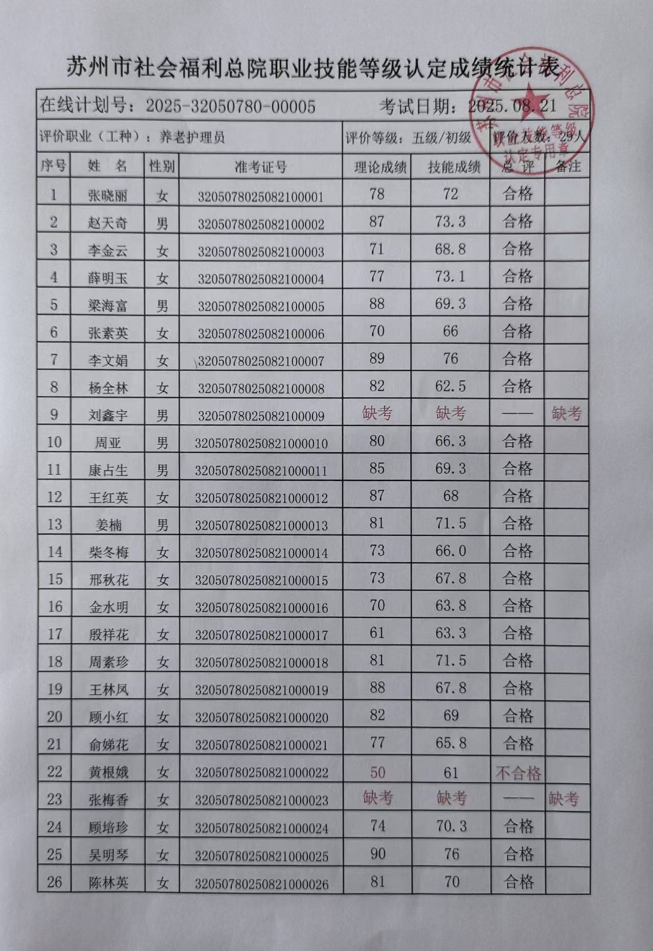 苏州市社会福利总院职业技能等级认定成绩公示(08.21)