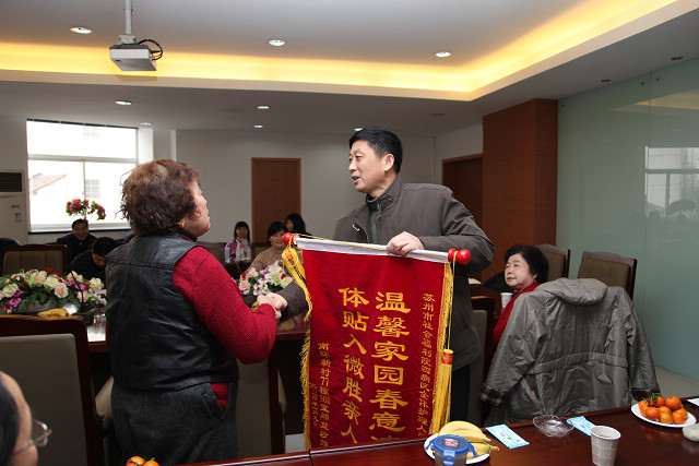 张书记首先就我院09年度各项工作的开展情况,特别是养老护理方面各项工作和制度的落实情况向家属代表作了简要介绍。家属们也争相发言,感谢我院干部职工对寄养老人的关爱与照顾。大家纷纷表示,福利院的工作非常不易,是一个上下配合的系统工程,花了很多精力,做了很多努力,克服了很多外人意想不到的困难,为寄养老人营造了家一般温馨的环境,真正实现了“把孝心献给老人”的承诺。多位家属更是特意送来了锦旗和感谢信,顾益珍老人的家属一边亲手将“温馨家园春意浓,体贴入微胜亲人”锦旗交到严院长手中,一边紧握着院长的手,眼含热泪地感谢福利院工作人员的精心照顾。会场气氛热烈温馨,感人至深。在对我院近年来的环境建设、服务质量给予充分肯定的同时,家属们也积极地献计献策,为我院的建设发展提出了许多中肯、宝贵的意见和建议。