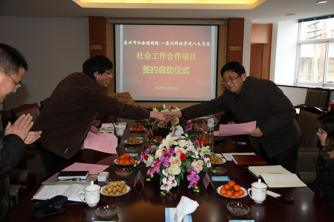 元月22日上午,“苏州市社会福利院—苏州科技学院人文学院社会工作合作项目”签约启动仪式在市社会福利院隆重举行。市社会福利院院长严文龙,苏州科技学院人文学院院长祝曙光以及“两院”社会工作者及相关专业教师参加了仪式。