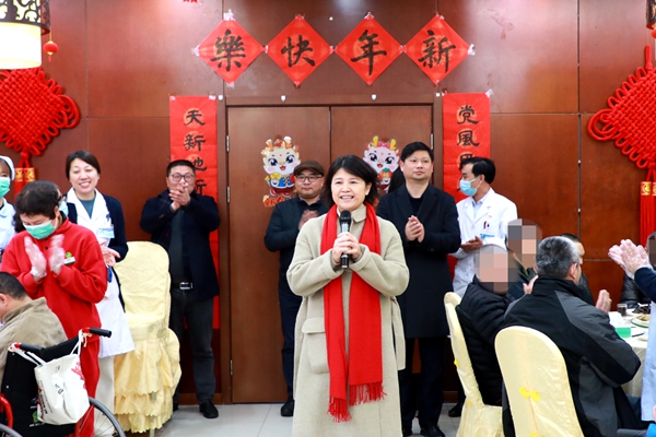餐厅内张灯结彩、暖意融融,处处洋溢着浓浓的年味。食堂工作人员切菜洗菜,颠锅掌勺,忙的不亦乐乎,从桂花糖藕到松鼠桂鱼,从酱卤牛肉到清蒸甲鱼,从清炒时蔬到全家福,每一道菜品都色香味俱佳,每一道菜品都让人回味无穷。用餐前,总院党委书记、院长顾彩娟代表全院职工向院内服务对象致以新春问候,并送上美好的新年祝福,祝服务对象们在新的一年里身体健康、开心快乐,诸事顺利。席间院领导与其他工作人员一起为服务对象端菜、夹菜,服务对象们在温暖的大家庭里一边品尝着丰盛的菜肴,一边感谢总院工作人员的辛勤付出,个个脸上都露出了幸福的笑容。