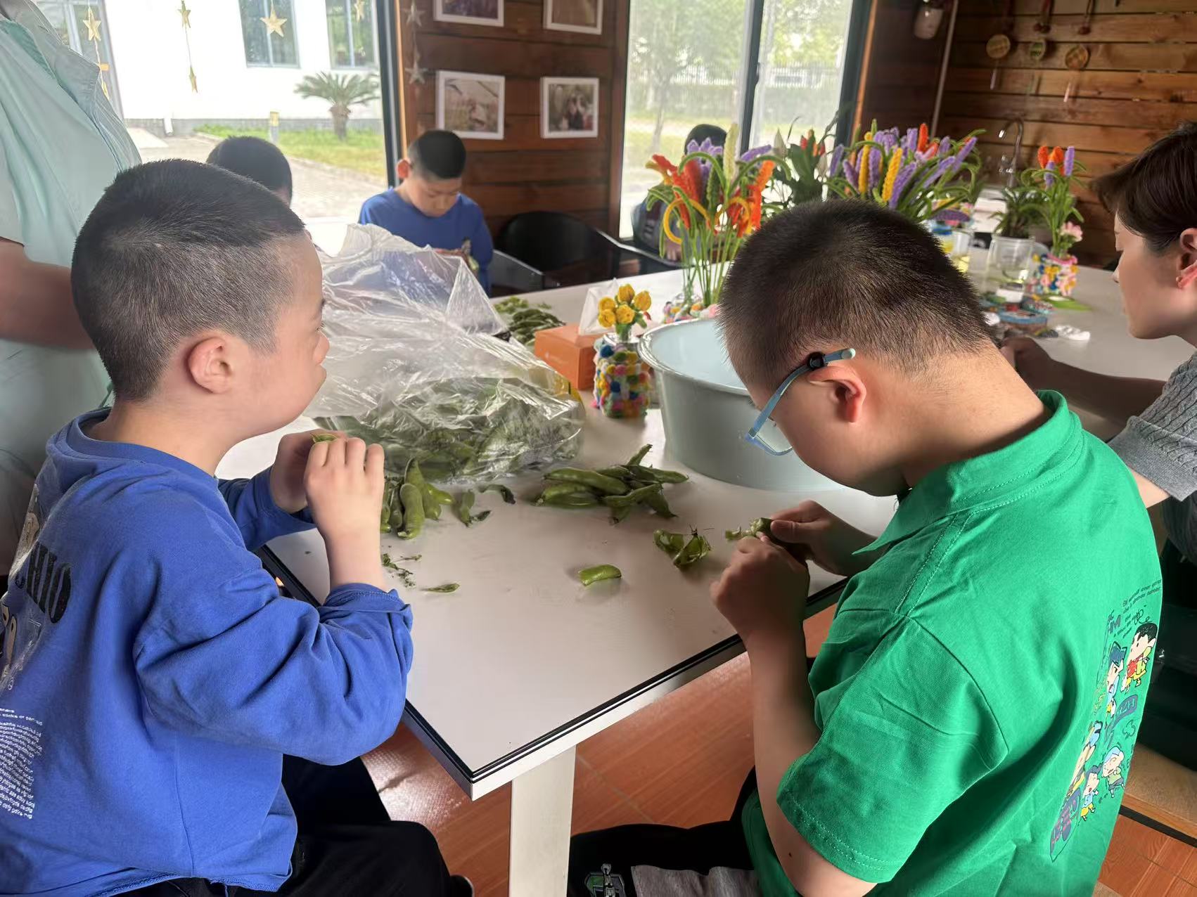 活动设置五个场地,分别是田间体验区、烘培体验区、小动物饲养体验区、花卉养护体验区、休闲水吧。总院四个中心的服务对象在工作人员的陪同照护下积极参与职业康复体验活动,通过采摘蚕豆、剥豆子、洗菜、饲养小动物、参与烹饪等环节,在劳动中感受精神的放松和收获的喜悦。