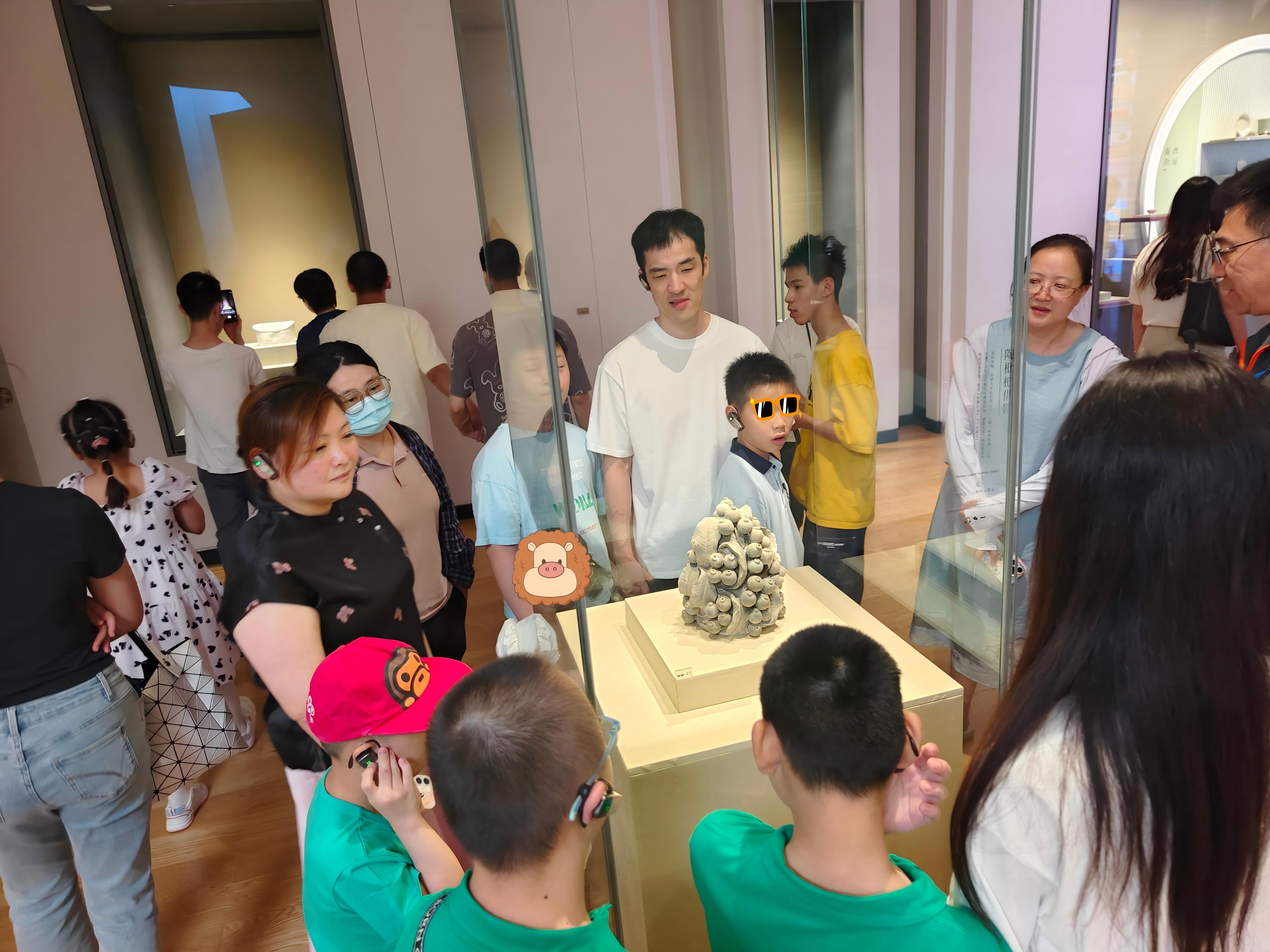 孩子们在讲解志愿者的引导下步入博物馆展厅。从新石器时代的陶器、春秋战国的青铜剑,到唐宋时期的瓷器、明清的书画,志愿者以生动易懂的语言,将文物背后的故事娓娓道来。孩子们簇拥在展柜前,时而惊叹,时而提问,眼神中充满好奇。