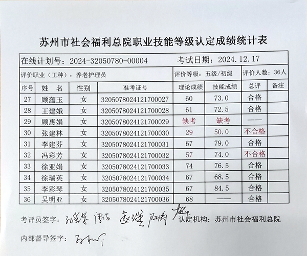 苏州市社会福利总院职业技能等级认定成绩公示