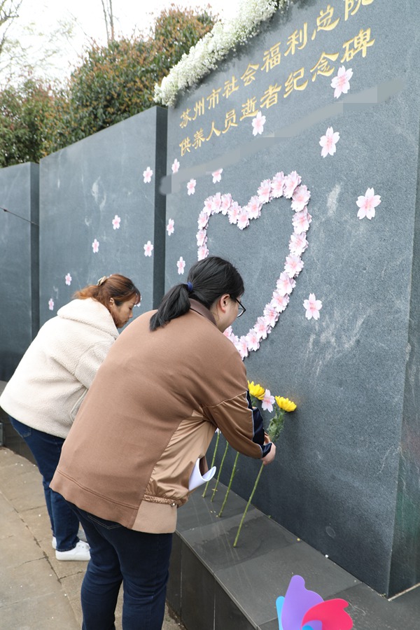 在国家民政部倡导推广绿色殡葬的大背景下,前期我院与吴中区木渎镇山陵文化产业管理委员会协调,在凤凰公墓南四区的市级绿色殡葬纪念园内设立可降解葬专区安葬我院“三无”供养逝者。在今天的仪式上,共有12名“三无”供养逝者的入葬,参加仪式的全体工作人员为“三无”供养逝者默哀,并精心准备了祈福语贴花,粘贴在镌刻着“三无”供养逝者名字的纪念碑上,还献上了鲜花和风车,今后总院每年将组织党团员开展祭扫活动。