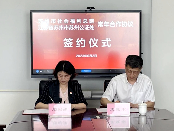 2023年6月2日上午,“苏州市社会福利总院与江苏省苏州市苏州公证处常年合作协议”签约仪式在总院1号楼举行。总院党委书记、院长顾彩娟、苏州公证处主任王晓军及相关职能科室领导参加了签约仪式。
