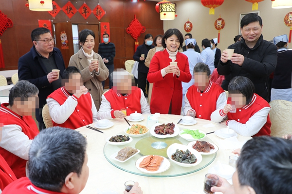餐厅内张灯结彩、暖意融融,处处洋溢着浓浓的年味。食堂工作人员切菜洗菜,颠锅掌勺,忙的不亦乐乎,从桂花糖藕到松鼠桂鱼,从酱卤牛肉到清蒸甲鱼,从清炒时蔬到全家福,每一道菜品都色香味俱佳,每一道菜品都让人回味无穷。用餐前,总院党委书记、院长顾彩娟代表全院职工向院内服务对象致以新春问候,并送上美好的新年祝福,祝服务对象们在新的一年里身体健康、开心快乐,诸事顺利。席间院领导与其他工作人员一起为服务对象端菜、夹菜,服务对象们在温暖的大家庭里一边品尝着丰盛的菜肴,一边感谢总院工作人员的辛勤付出,个个脸上都露出了幸福的笑容。