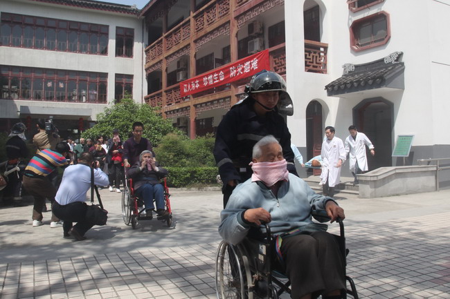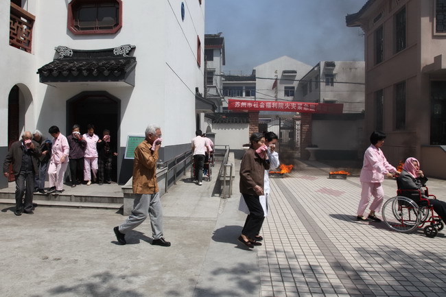 我院对演练活动做了充分准备并制定预案,院党总支书记、院长孙惠忠亲自担任总指挥。演练阵容包括通信联络小组、疏散引导小组、救护小组和灭火行动小组,并邀请金阊区消防大队官兵现场配合。上午10时,演练正式开始。首先点燃三只火盆模拟护理部颐养楼某房间起火燃烧并快速蔓延,严重威胁在住老人安全。通信联络小组发现情况立即通知门卫电铃报警,随后,总指挥发出灭火疏散指令,疏散引导小组带领我院义务消防队员迅速进入失火地点组织引导老人从各个安全出口紧急疏散至大楼东北面的多功能厅并集中清点人数;同时,救护小组将救护车开至失火楼前进行模拟救护,灭火行动小组使用灭火器及与消防栓连接的水带对火盆进行扑救。上述过程紧张、有序、快速、安全,经所有参加演练人员通力协作,仅用2分钟时间,完成了护理部颐养楼内全部43名老人的疏散和救护,火盆内火焰也被迅速扑灭,整个演练活动取得圆满成功。