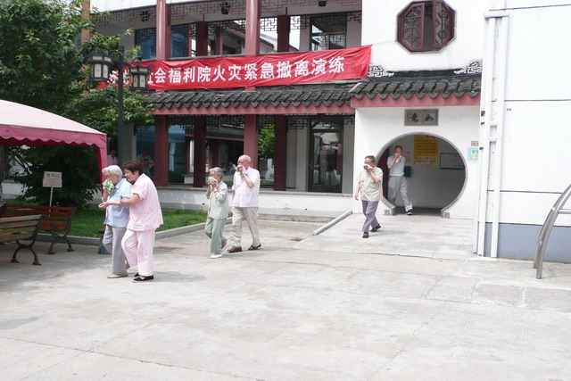 演练模拟我院公寓部3号楼某房间突发火灾,所有入住老人紧急撤离。上午10时,演练开始,3号楼当班护理员在发现火情后第一时间报警,保卫部门通知门卫以电铃二短一长作为火警应急信号。公寓部3号楼入住老人26名,当时外出4名,楼内共有老人22名,其中包括双目失明和腿脚不便的老人。在听到报警信号后,公寓部翁丽琴副主任带领所有护理员迅速进入楼内帮助老人开始撤离:一层人员从一层大门撤离,二、三层人员通过连廊从1号楼大门撤离,所有老人安全撤离至3号楼东北侧空地,总共用时不到2分钟,演练取得圆满成功。