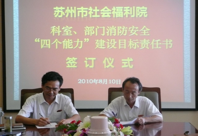 会上,孙院长与各科室、部门负责人签订了《苏州市社会福利院科室、部门消防安全“四个能力”建设目标责任书》,各科室、部门负责人郑重承诺将严格履行职责,积极配合完成我院“四个能力”建设目标。张院长在会上对当前开展构筑“防火墙”工程和“四个能力”建设的重要意义进行了详细阐述,结合我院实际分析如何采取积极有效的措施进一步加强“四个能力”建设。孙院长强调,全院上下要对“四个能力”基本知识做到人人知晓、掌握、过关,平时要对身边的隐患时时提防、不时排查、及时整改,认真细致做好安全工作,将安全工作放在突出位置来抓。