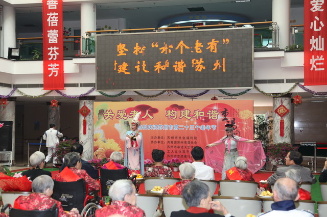随后,来自苏州市半边天艺术团、工人文化宫艺术团和团市委的文艺爱好者们为院内的老人奉上了一场精彩的艺术盛宴。翩翩起舞的“琴系姑苏”让老人们领略古城的柔美,经典的越剧名段“沙漠王子”得到了满堂喝彩,一曲男声独唱“敢问路在何方”将演出推向了高潮。精彩的文艺节目让老人们流连忘返,也让老人大饱了眼福,为九九重阳节谱写了和谐美丽的诗篇。