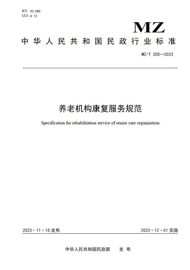 11月22日民政部官网发布《地名标志耐候性能试验方法》等4项推荐性行业标准的公告。其中,我院参与起草的MZ/T 205—2023《养老机构康复服务规范》自2023年12月1日起实施,规定了养老机构康复服务的基本要求、服务流程、服务内容与要求、服务评价与改进等内容。